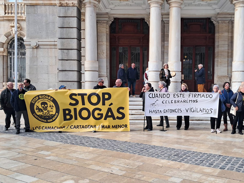 La plataforma ciudadana Stop Biogás Los Camachos vuelve a concentrarse públicamente en la Plaza del Ayuntamiento de Cartagena coincidiendo con la celebración del pleno municipal. Su objetivo principal reitera la paralización definitiva del proyecto de la macroplanta de biogás de la empresa HeyGaz Biomethane prevista para el polígono industrial de Los Camachos.