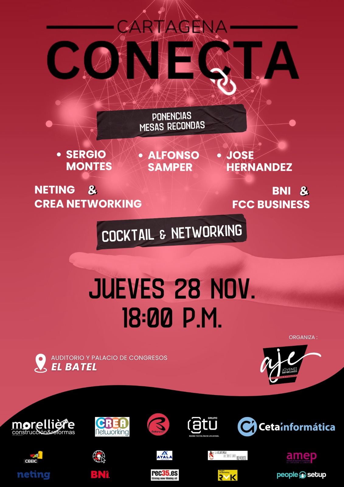 La Asociación de Jóvenes Empresarios (AJE) de Cartagena organiza la jornada ‘Cartagena Conecta’, el próximo jueves 28 de noviembre a las 18:00 horas, en el auditorio El Batel, un evento de networking con el objetivo de explorar nuevas estrategias y oportunidades empresariales para los asistentes.