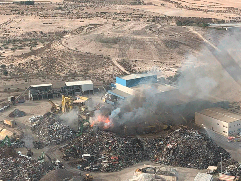 Los servicios de emergencia trabaja en la extinción de un incendio que se ha declarado sobre las 17.15 hora de este miércoles en la planta de la empresa Erecycling, del grupo Global París dedicada al reciclaje de vehículos y material eléctrico en Cañada Hermosa, en el término municipal de Murcia.