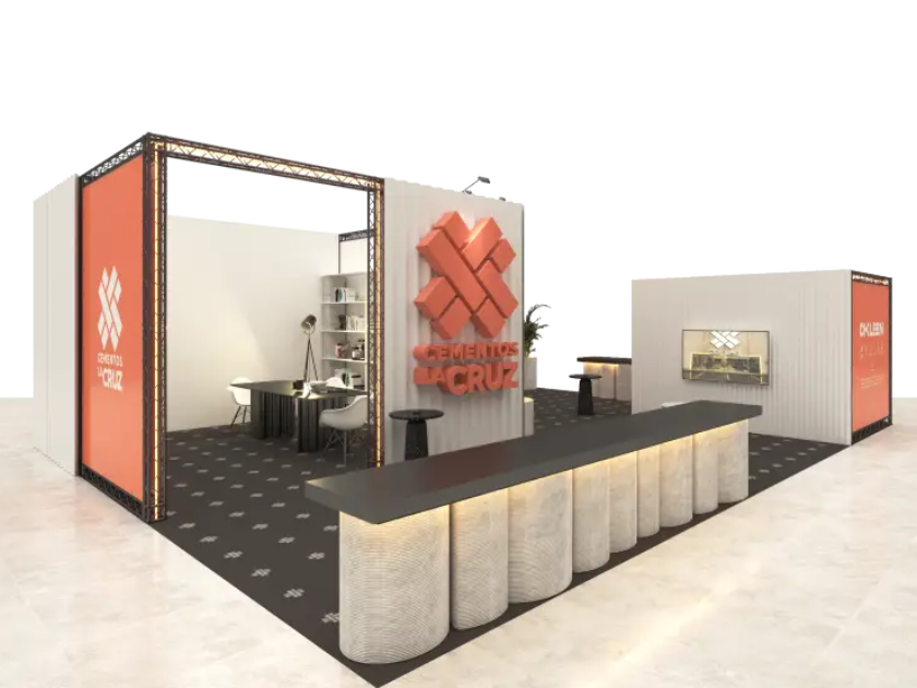 El stand incluyó también mostradores cilíndricos fabricados mediante impresión 3D de hormigón, uno de los desarrollos clave del departamento de I+D de Cementos la Cruz. Estas piezas, diseñadas para ser ligeras y funcionales, añadieron un elemento de tecnología avanzada que reflejó las capacidades innovadoras de la empresa.