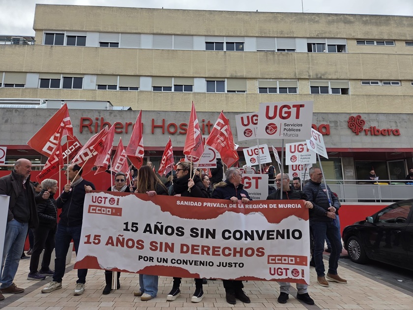 Dentro de su ronda de manifestaciones, que este miércoles les ha llevado a Molina de Segura, CCOO y UGT se concentrarán este jueves, a partir de las diez de la mañana, en la puerta principal del Hospital Ribera Virgen de la Caridad de Cartagena para informar a los usuarios de las condiciones laborales que arrastra el sector de la sanidad privada en la Región de Murcia.