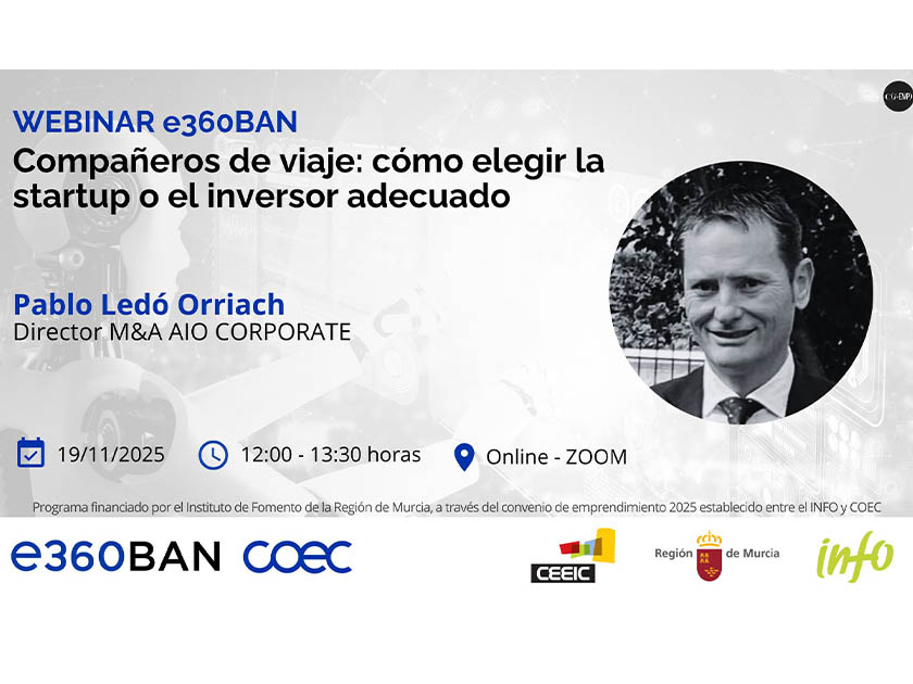 El Centro Europeo de Empresas e Innovación de Cartagena (Ceeic), junto con la Confederación Comarcal de Organizaciones Empresariales de Cartagena (Coec) y el Instituto de Fomento de la Región de Murcia (Info), han anunciado un nuevo webinar de la red e360BAN bajo el título ‘Compañeros de viaje: cómo elegir la startup o el inversor adecuado’.