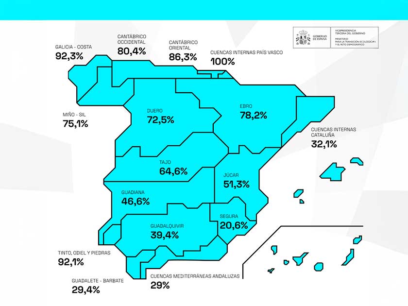 Los embalses españoles almacenan actualmente 32.691 hectómetros cúbicos (hm³) de agua, 3.718 hm3 más que a comienzos del mes de enero. La mayoría de este incremento se ha producido durante la última semana, en la que ha aumentado en 2.255 hectómetros cúbicos (el 4,0% de la capacidad total actual de los embalses).