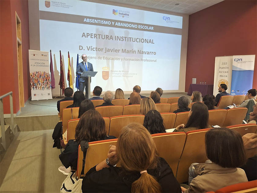 Más de 200 profesionales de la educación se han reunido este lunes en el IES Ramón Arcas Meca de Lorca, en una jornada organizada por el Centro de Profesores y Recursos (CPR) para abordar el absentismo escolar y el abandono educativo temprano. La cita fue inaugurada por el consejero de Educación y Formación Profesional, Víctor Marín, y el alcalde de Lorca, Fulgencio Gil.