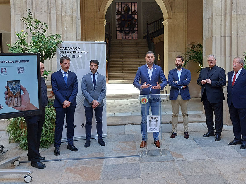 El director del Instituto de Turismo de la Región de Murcia, Itrem, Juan Francisco Martínez, junto al obispo de la Diócesis de Cartagena, José Manuel Lorca, y el alcalde de Caravaca, José Francisco García, han explicaron todas las funcionalidades de estas aplicaciones en un acto celebrado en el Palacio Episcopal de Murcia.