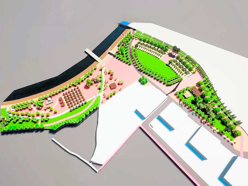 El acceso al parque se hará a través de una gran plaza porticada en la zona sur del espacio que va a ocupar, similar a la entrada de Murcia Río en el entorno del Malecón, desde la que se extenderá el área más “urbana” del parque siguiendo el trazado de la autovía hasta el cauce del río Segura.