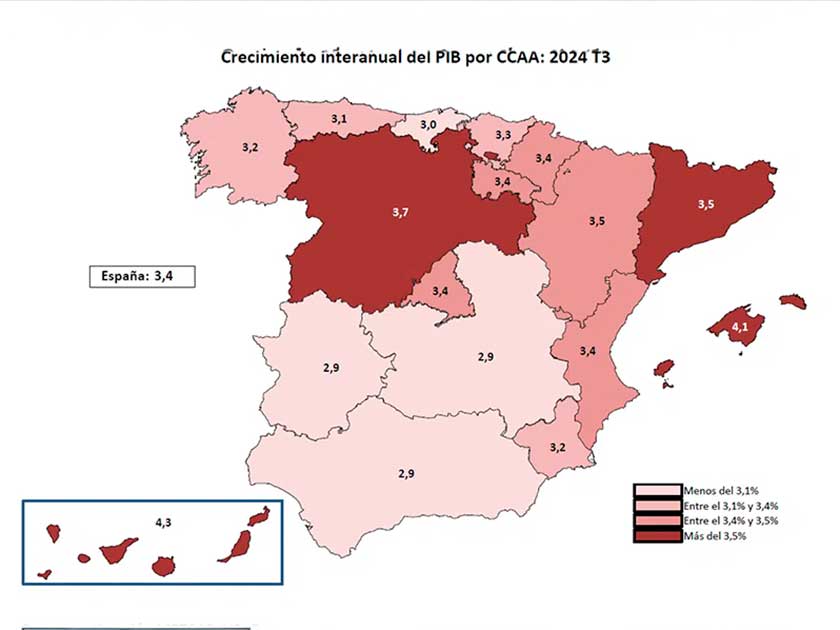 En términos interanuales, se observa que Canarias es la región que presenta el mayor crecimiento del PIB, seguida de Illes Balears, con incrementos del 4,3% y 4,1%, respectivamente, superiores al crecimiento del conjunto de España.