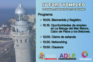 El IV foro YOMPLEO de la Agencia de Desarrollo Local y Empleo (ADLE) La Manga, Cabo de Palos y Los Belones se celebra el próximo 12 de marzo. La iniciativa, impulsada desde el Ayuntamiento de Cartagena, arrancará a las 10:00 horas desde el Subup Hostel de Cabo de Palos.