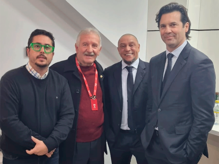 José Luis Reverte (i), responsable del Club de Empresas, junto a Bienvenido Gallego, presidente de honor de la Minera y los exjugadores Roberto Carlos y Santiago Solari