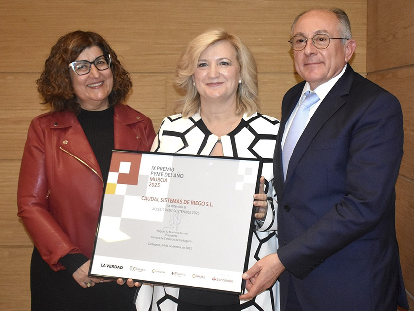 La lumbrerense Caudal Sistemas de Riego ha sido distinguida con el Premio Pyme Sostenible 2025 de la Región de Murcia por su modelo de innovación y sostenibilidad, en el marco de la IX edición del Premio Pyme del Año, organizado por las Cámaras de Comercio, el Banco Santander y la Cámara de España. El galardón pone en valor la integración de la sostenibilidad en toda su cadena de valor y su capacidad para ofrecer soluciones de riego tecnológicas y respetuosas con el entorno.