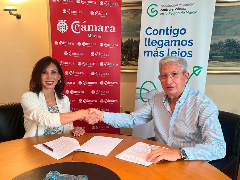 El presidente de la Asociación Española Contra el Cáncer en la Región de Murcia (AECC), Manuel Molina Boix, y la presidenta de la Cámara de Comercio de Murcia, Miryam Fuertes, han firmado un convenio de colaboración para impulsar la labor de la AECC en la Región.