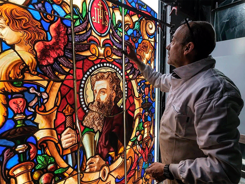 Durante estos ocho meses de trabajo se han llevado a cabo labores de limpieza y restauración de los calibres de vidrio, la revisión y restauración de los tinglados de plomo y se ha elaborado un marco perimetral de latón para cada panel que garantice la estabilidad vertical.