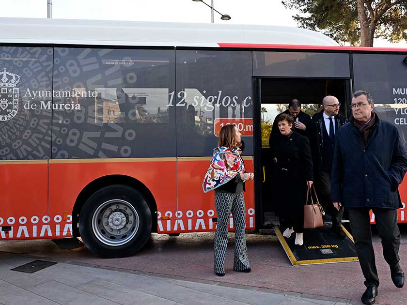 El Consistorio murciano ha adquirido siete nuevos autobuses para reforzar la flota de Transpotes de Murcia, que han sido presentados esta mañana por el alcalde de la ciudad, José Ballesta. Acompañado del concejal de Movilidad, José Francisco Muñoz, y de la vicerrectora de planificación de las Infraestructuras de la Universidad de Murcia, Belén López, y parte del equipo de Gobierno han subido a estos nuevos vehículos, que han sido rotulados con el emblema de Murcia 1200.