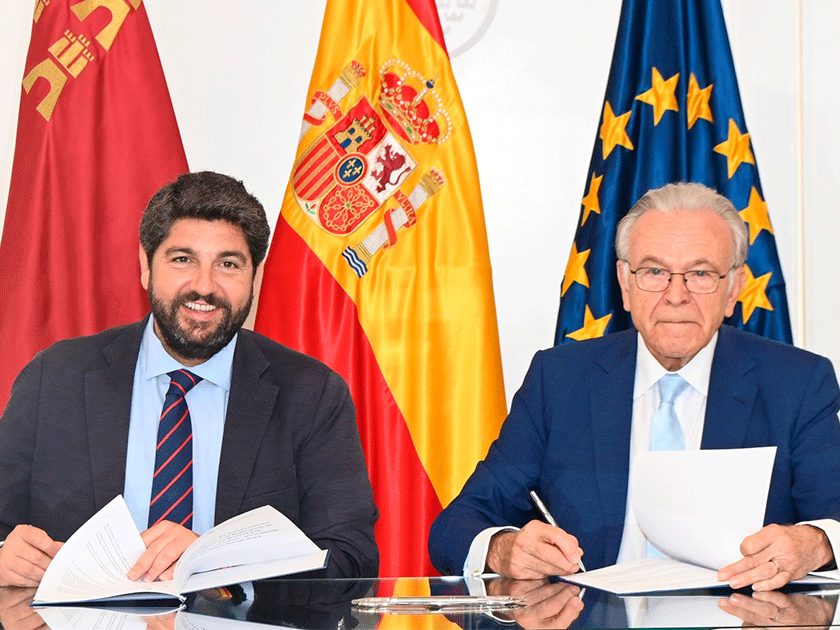 El jefe del Ejecutivo regional, Fernando López Miras, y el presidente de la Fundación, Isidro Fainé, rubricaron en el Palacio de San Esteban el convenio marco que sienta las bases de esta cooperación en materia de acción social, cultural, científica y educativa, y que incluye un aumento de 1,2 millones de euros con respecto a los 10,8 destinados en 2023.