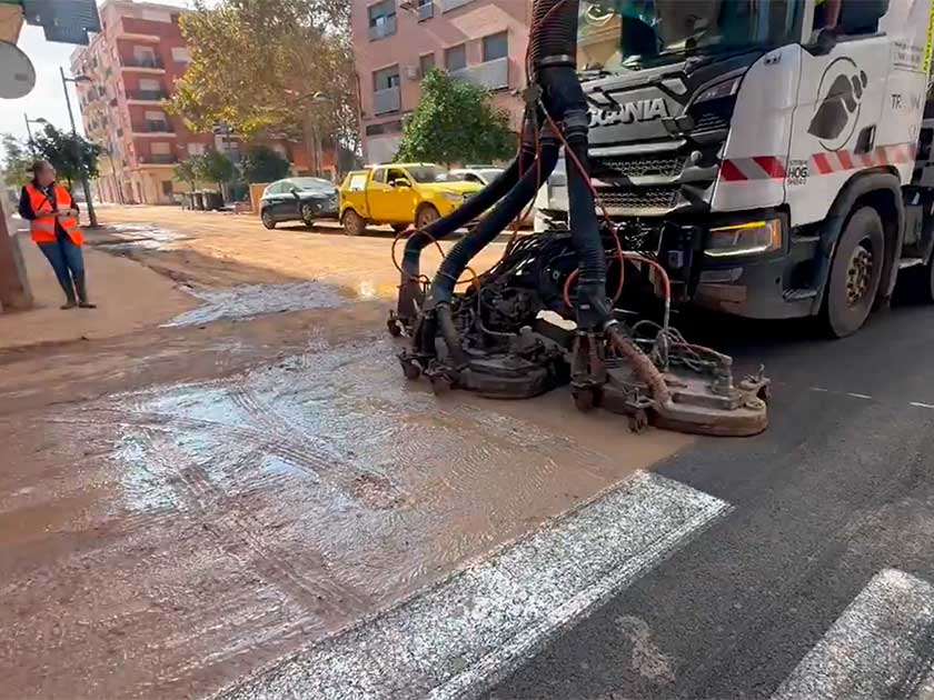 La empresa Multiservicios Tritón, que ha desplazado dos de sus equipos para ayudar en la mejora del estado de las calles, hizo una prueba para comprobar si podía usarse en la limpieza y viendo el resultado sigue despejando a los valencianos del barro de sus calles.