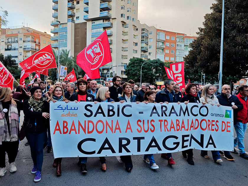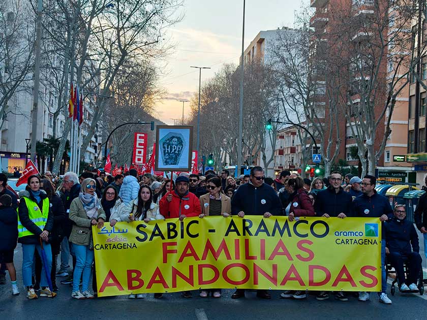 Entre dos mil y tres mil personas, entre trabajadores de Sabic, familiares y personal de otras empresas y múltiples organismos que les apoyan, han recorrido este martes las calles de Cartagena como medida de protesta ante los posibles despidos masivos y el cierre de la planta Lexan 1 tras la compra de Sabic por la multinacional Mutares a la actual propietaria, Aramco.