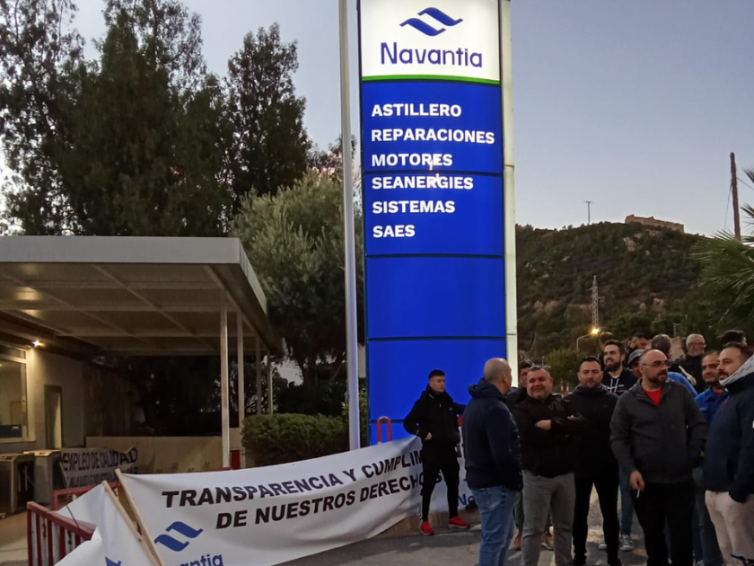 La jornada de paro de 24 horas convocada por el Comité Intercentros de Navantia en todas sus sedes, registra un amplio seguimiento en el astillero de Cartagena, donde numerosos trabajadores se han movilizado, desde las seis de la mañana, para exigir avances en la negociación del convenio colectivo y denunciar la falta de transparencia y la vulneración de sus derechos laborales.