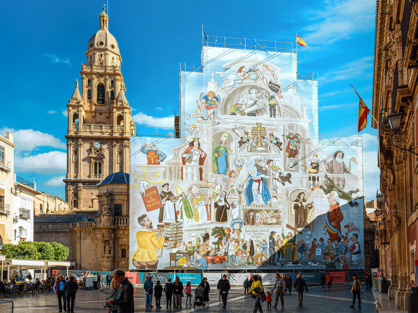 La lona, que integra de forma natural a todas las empresas que han colaborado con donaciones, presenta una ilustración que rinde homenaje a la historia y cultura de la ciudad. Esta obra fue creada por el reconocido humorista gráfico José Manuel Puebla, quien ha sabido plasmar en la ilustración un vínculo entre el patrimonio murciano y las empresas involucradas en la restauración.