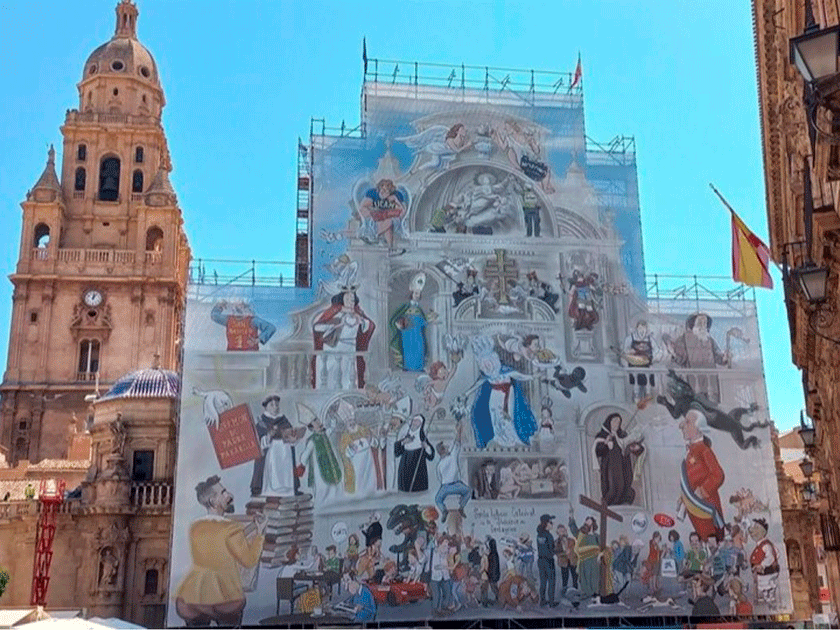 Se trata de una lona de mil metros cuadrados que protege las obras de restauración de la fachada de la Catedral de Murcia y que, además, se ha convertido en un gran reclamo para atraer a mecenas. Todas las empresas que han donado fondos para la restauración han sido integradas de forma natural en una ilustración que homenajea la historia y la cultura de la ciudad y que ha sido realizada por el humorista gráfico José Manuel Puebla.