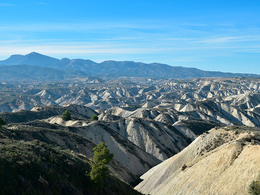 En contraste con las zonas verdes de Sierra Espuña, a sus pies se encuentra un espacio árido y semidesértico entre Alhama de Murcia y Librilla, creado por la erosión de la piedra calcita y arcillosa. Semejante a un paisaje lunar, en él encontrarás diversas rutas de senderismo para observar los badlands, estas tierras áridas moldeadas por las intensas lluvias y la escasa vegetación.