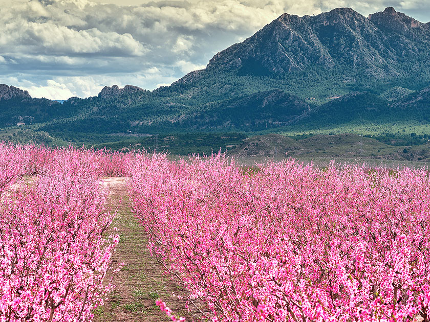 La visita a los campos de melocotoneros, albaricoqueros, ciruelos y otros árboles que estallan en flor desde finales de febrero a marzo nos permitirá contemplar un espectáculo de color muy vistoso en los alrededores de Cieza. Campos teñidos de rosa y blanco según el fruto que se cultive son un espectáculo singular disponible durante unas pocas semanas y que merece la pena contemplar. Durante la Floración de Cieza se organizan rutas guiadas para vivir este momento efímero.