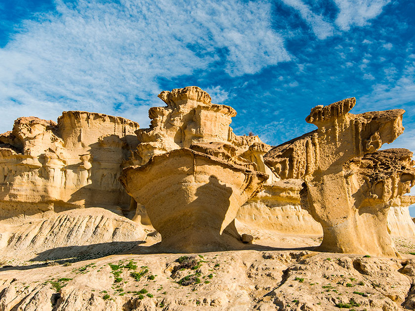 La erosión ha creado un lugar de ensueño en la costa de Mazarrón, de ahí que se la conozca como la Ciudad Encantada. Declarado monumento de interés natural, este espacio arcilloso situado junto a la playa de Bolnuevo invita a ver cómo cambian sus sombras a la orilla del mar mientras el sol se refleja en ellas. Muy recomendable su visita en las horas del amanecer y el atardecer.