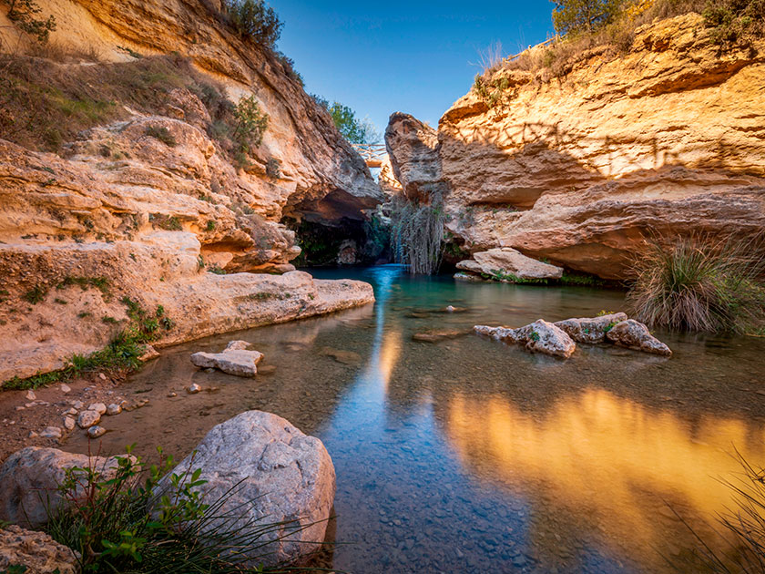 Este paraje de gran belleza natural está situado en el cauce del río Mula y a pocos kilómetros del casco urbano de Bullas. En él pueden observarse procesos erosivos generados en una formación de areniscas y travertinos, que han originado una bóveda donde se precipita el agua en cascada desde varios metros de altitud. Este agua cae a una poza utilizada ampliamente en época estival. Si simplemente pretendes visitar el lugar, aprovecha los meses de invierno para evitar aglomeraciones. En caso contrario, deberás atender el régimen de visitas del entorno.