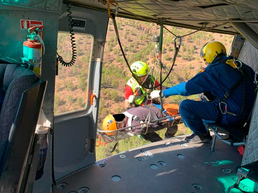 El Centro de Coordinación de Emergencias de la Región de Murcia ha recibido una llamada a las 13.00 horas en la que solicitaban ayuda para este hombre, que se había dañado una rodilla mientras realizaba trabajos forestales bajo una línea eléctrica. Ni él podía volver a una zona segura por sí mismo, ni tampoco sus acompañantes podían trasladarlo.