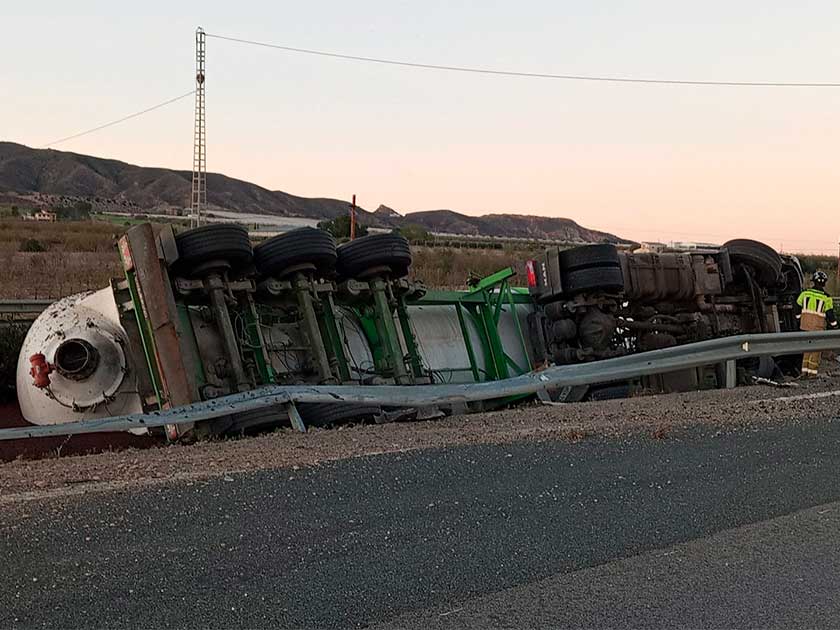 Un camión cisterna ha sufrido en la tarde de hoy un accidente en el kilómetro 657 de la A-7 en dirección Alicante. A las 17:19 horas, numerosas llamadas informaban al Centro de Coordinación y Emergencias 112 Región de Murcia sobre el accidente que había sufrido un camión cisterna, el cual se había salido de la vía, y se encontraba volcado en la mediana, a la altura de Puerto Lumbreras.