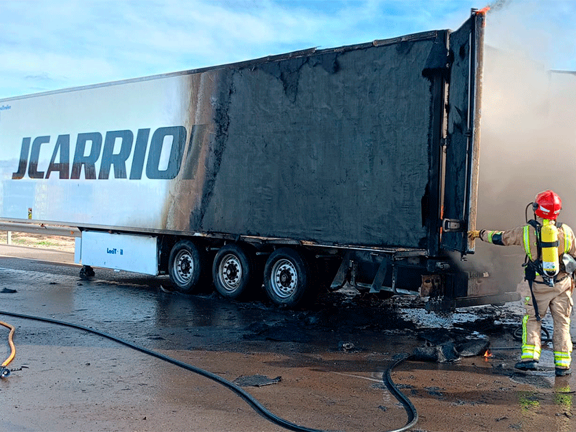Un camión frigorífico de la almeriense J.Carrión arde en la AP7, en Mazarrón